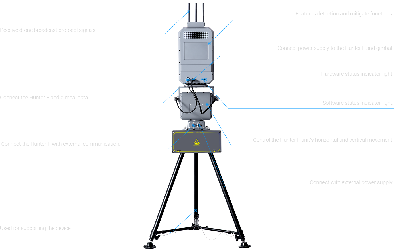 Hunter F is a fixed-site counter-UAS system that combines detection and mitigation in one integrated platform. It continuously monitors and decodes UAV communication signals to identify drone models in real time.By intercepting UAV broadcast messages, Hunter F retrieves critical flight data—such as GPS coordinates, altitude, speed, yaw angle, model, serial number (SN), and pilot location—with high accuracy.Leveraging advanced spectrum analysis, the system intelligently selects the optimal RF jamming strategy based on each drone’s communication signature, enabling precise targeting, directional disruption, and effective neutralization.